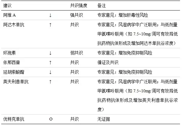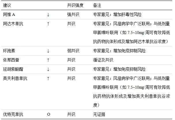 * 若血白细胞<3.0、中性粒细胞<1.0、血小板<100 或肝酶>基线值 2 倍,则减少剂量或停药。** 在某些情况下(如怀疑为低蛋白血症或使用了其他高血清白蛋白亲和力的药物)。*** 必要时行肝活检;对 PIIINP 持续异常等患者(为期 12 月以上,至少三个样本值>4.2mcg/l)应作考虑 治疗建议